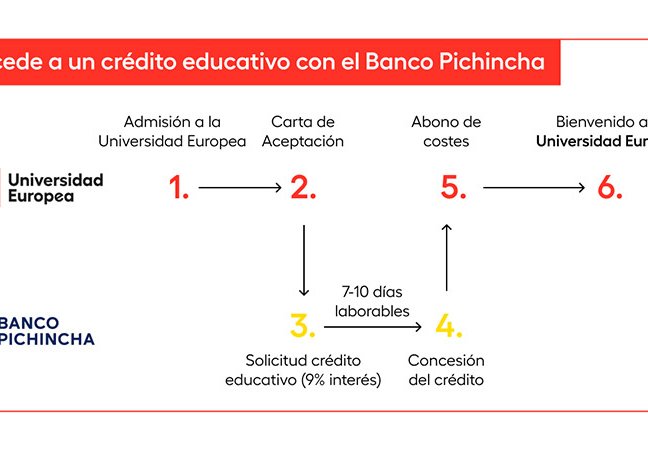 El Banco Pichincha, en convenio con la Universidad Europea, ofrece opciones de financiamiento al 9% de interés nominal. Estudia sin preocupaciones y empieza a pagar 6 meses después de terminar tus estudios.